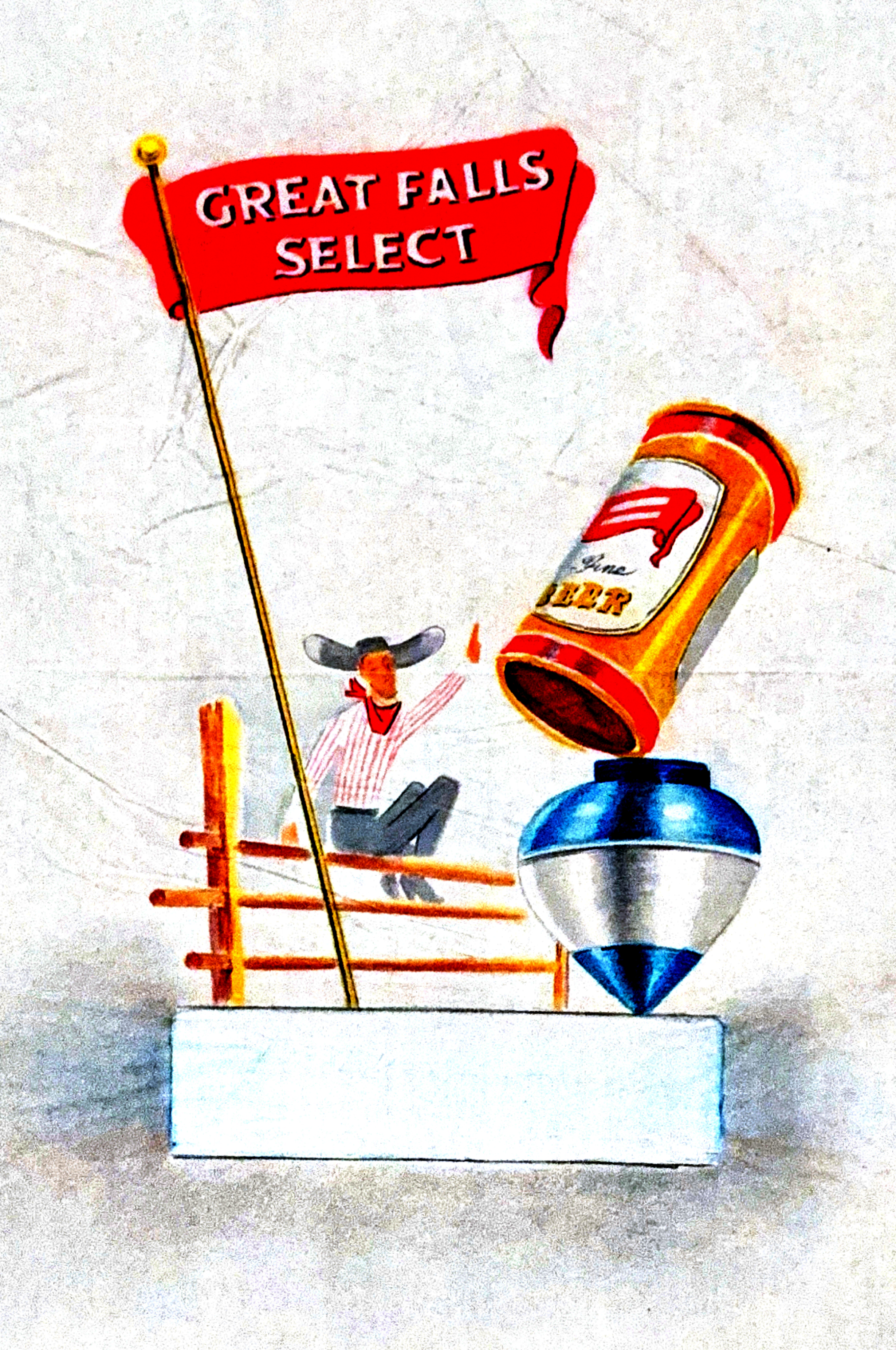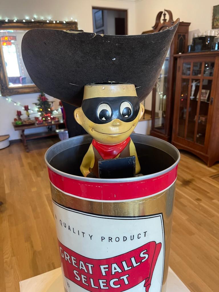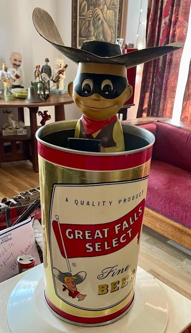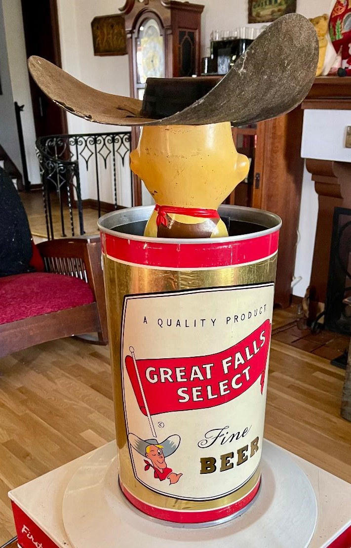 The Cowboy features a large Great Falls beer can with a giant cowboy hat on top. These large scale and whimsical motion display pieces(late 40’s-60’s) were used in grocery stores, to catch the consumer’s eye!