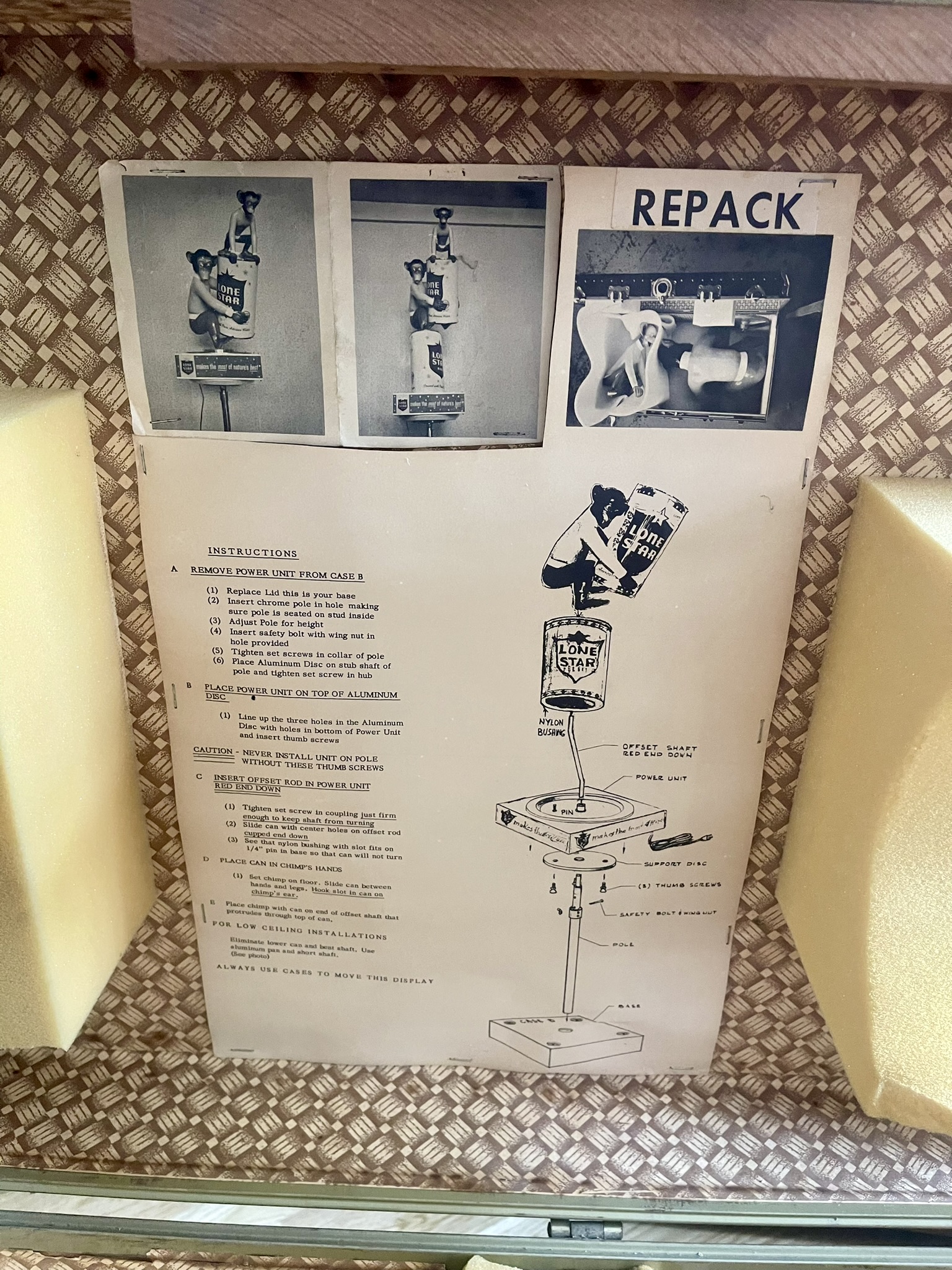 These lively characters were famously produced for Lone Star Beer and Burgermeister Beer, where they danced, clutched beer cans, and performed comic routines designed to stop shoppers in their tracks. Beyond these celebrated campaigns, Stanley’s design sketches reveal plans for monkeys in service of other brands — clever concepts that, though never manufactured, showcased his boundless imagination.