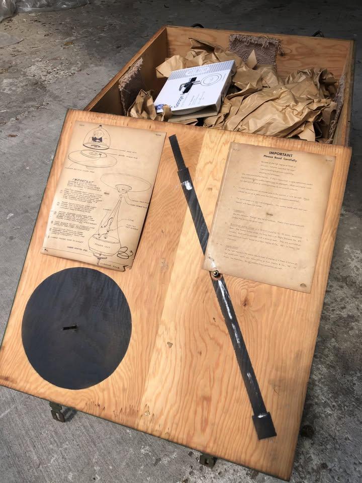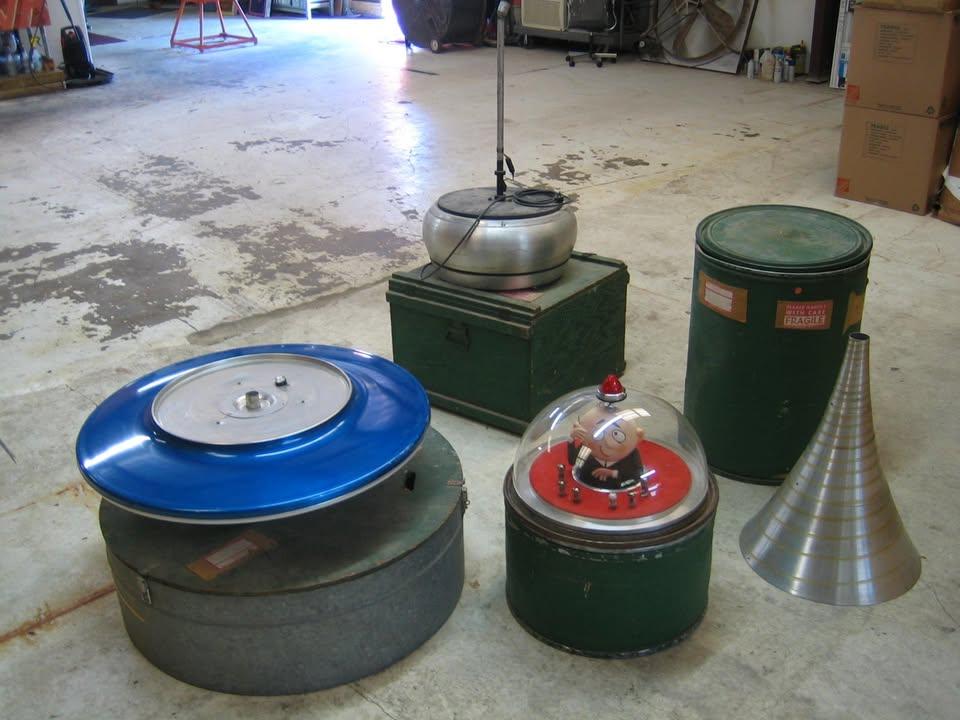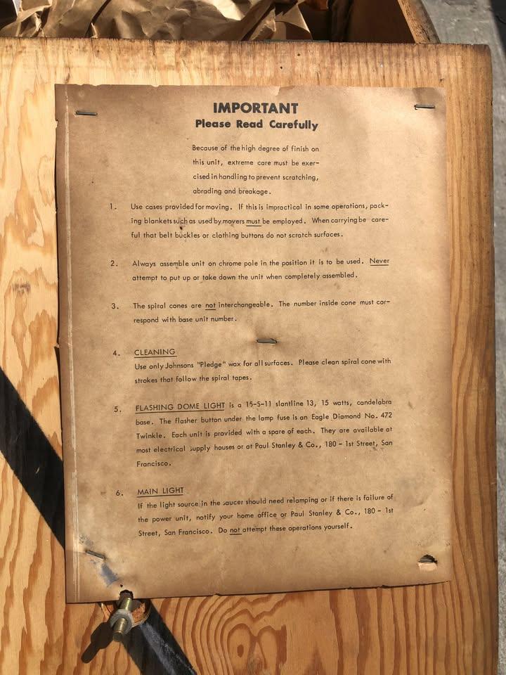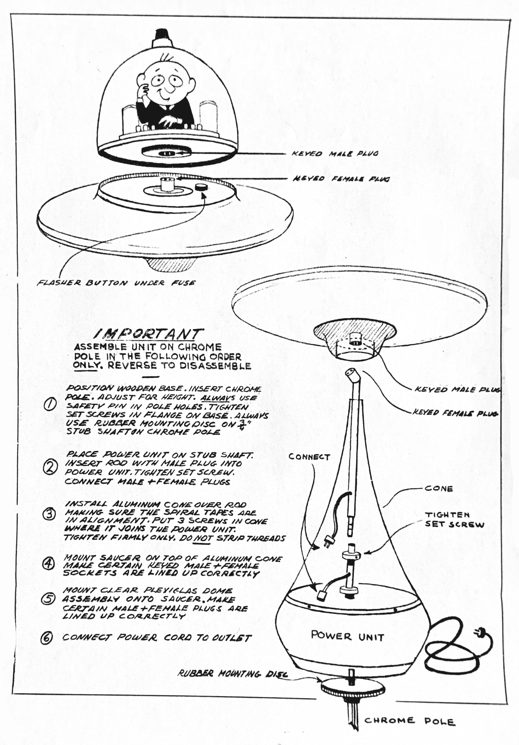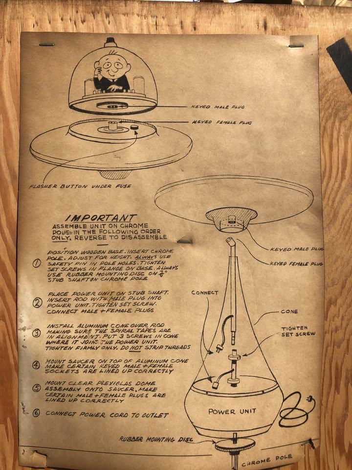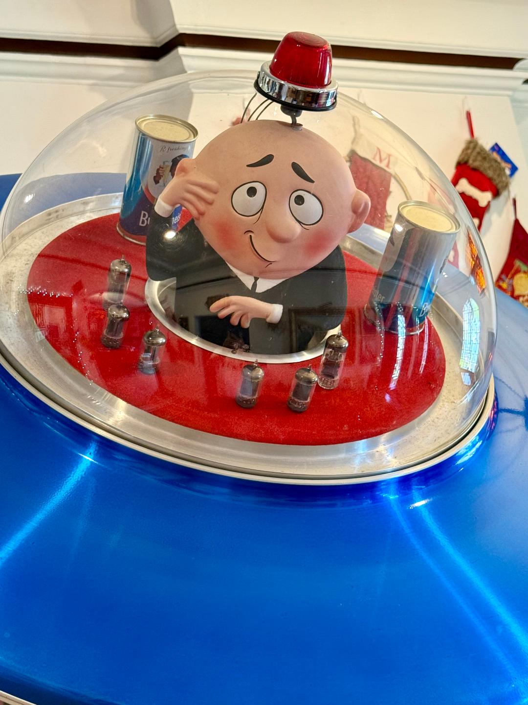 The flying saucer features two BURGIE beer cans in the cockpit of the flying saucer with the iconic BURGIE man. The futuristic space ship spins around at an angle with a flashing red light on the top giving the appearance of space travel. These large scale and and whimsical motion display pieces (late 40’S-60’S) were used in grocery stores, to catch consumer's eye EYE! These were considered the most unique advertising pieces ever built - mechanically complex, crafted by hand and built to last!